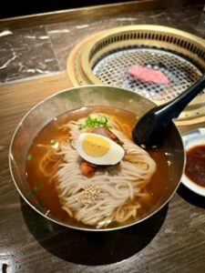 でんぷん、そば粉、小麦粉を合わせた自家製麺の別府冷麺。麺が太いのも特徴! 和風だしにしたことで当時一気に支持を得たそうです。横隔膜あたりの「マクミ」を食べながら、スッキリ澄んだスープを無限に頂けそうです✨ #別府 #beppu #焼肉 #noodle #foodculture