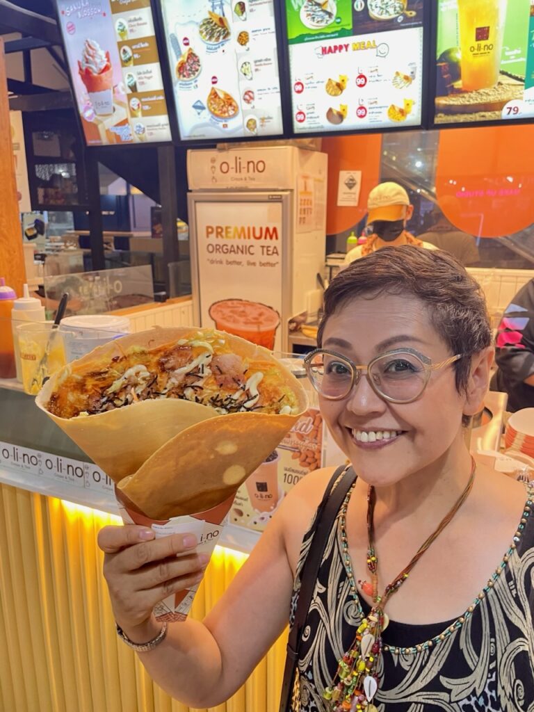 サイアムスクエアワンの地下にあるオリノクレープさんで、okonomiyaki 発見!パリパリクレープ生地とマヨソース、キャベツ、海苔がバランスよくトッピングされて、お好み焼の新スタイルにびっくりです! #お好み焼き #