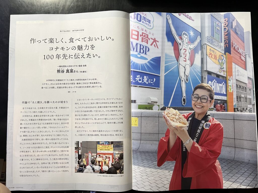 立命館の校友会会報誌にインタビューが掲載されました。道たこ連のハッピで撮影してもらいました! #道頓堀たこ焼連合会 #たこ焼き #立命館大学 #コナモン #コナモンの会長
