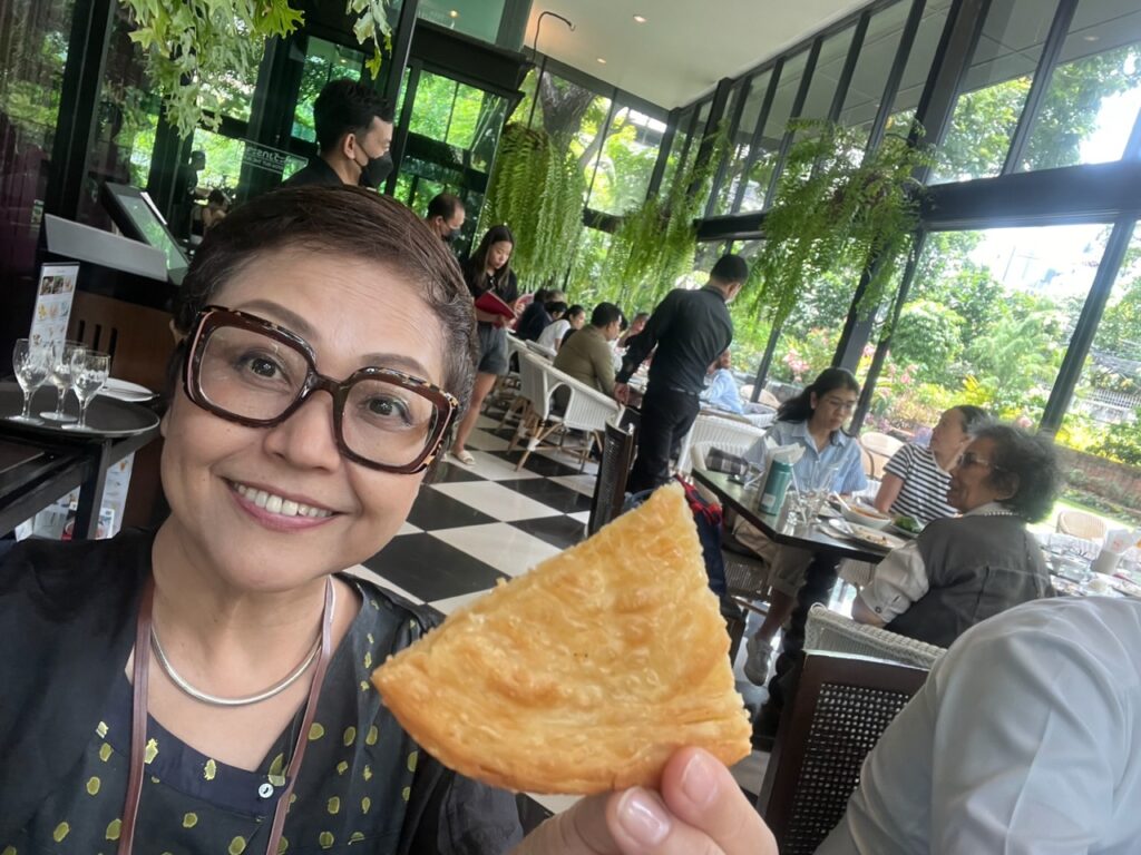 バンコク到着一軒目は、偶然見つけた楽しいタイ料理レストラン。「Madam Saranair」。パッションフルーツやメロンシェイクを飲みながら、前菜のゴールデンカップエビセンのタレは玉ねぎパクチー、セロリのソムタム、Fri