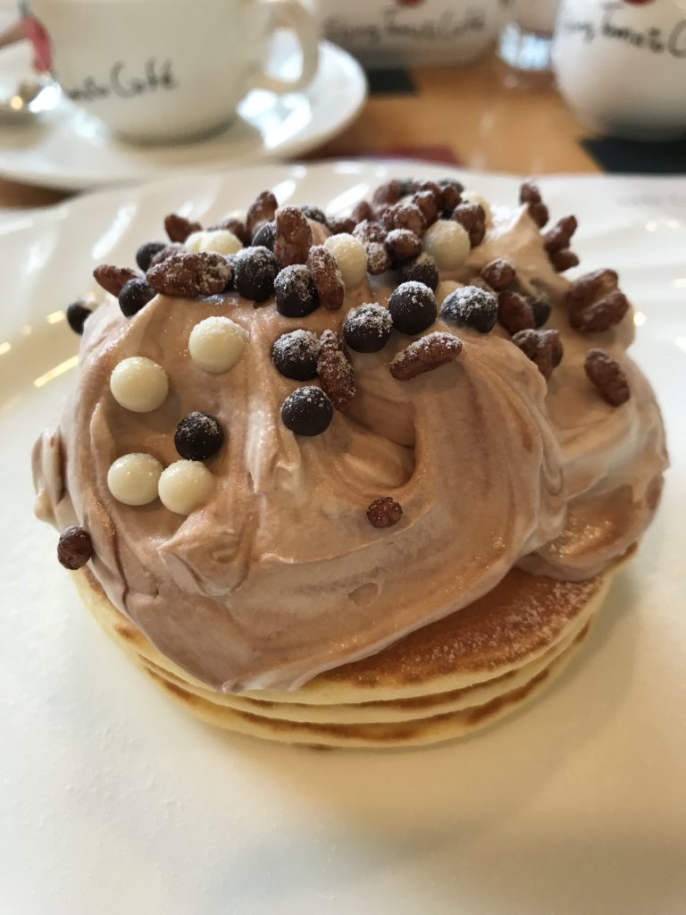 ワンプレートランチとミニパンケーキ。 直径10cmあまりの小さめですが、3枚重ねでちょうどいいボリューム。 北海道あずきクリームに、カシスソース、アイスが隠れてて、チョコチップやパフ系がトッピン、頬張ると口の中で、弾