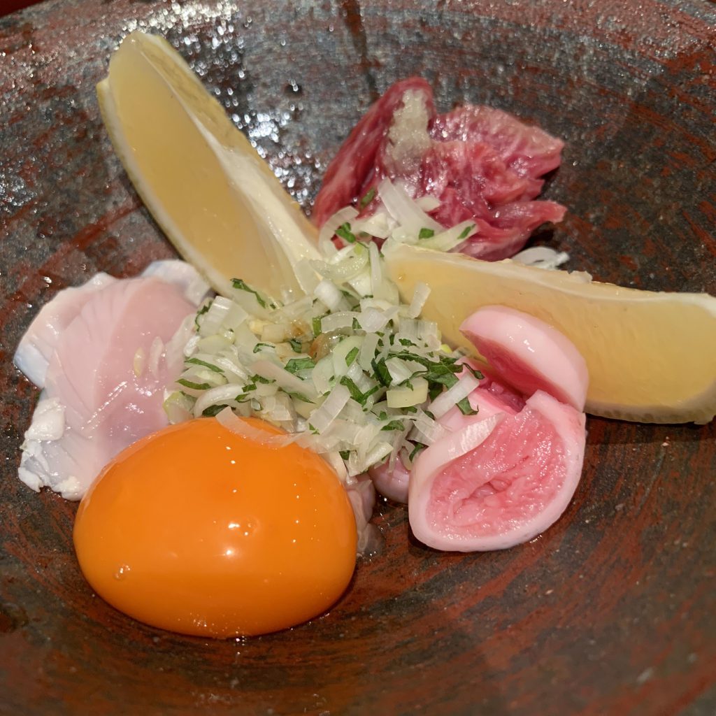 美味しくて、居心地のいいお店、たとえ一人でもくつろげるお店、鳥茂さん。 豚のレバーに始まり、小腸、タン、つくね、湯引きのお刺身 後半は牛、鳥、キャビア海苔巻、にゅうめんまで。