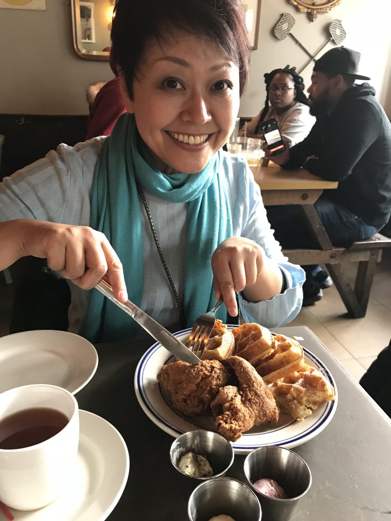 黒人スターを輩出したアポロシアター近くのレストランで、 初めて食べたのがワッフルチキンでした。 ワッフルの上のフライドチキン、そこにシロップをかけるという、意外なミスマッチに魅了されて以来、ワッフルチキン命なんです。 今