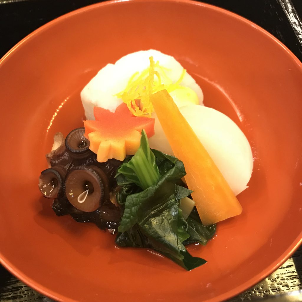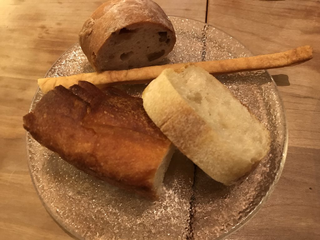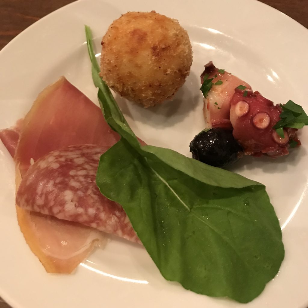 20年以上前に出かけてた京都の老舗イタリアンが大阪駅にも。当時は、屋号がイタリア語っていうのも珍しくて。 たこやき大のは、里芋のイカ墨ボール。 パスタもグリッシーニも、レアな鴨も美味しかったです。