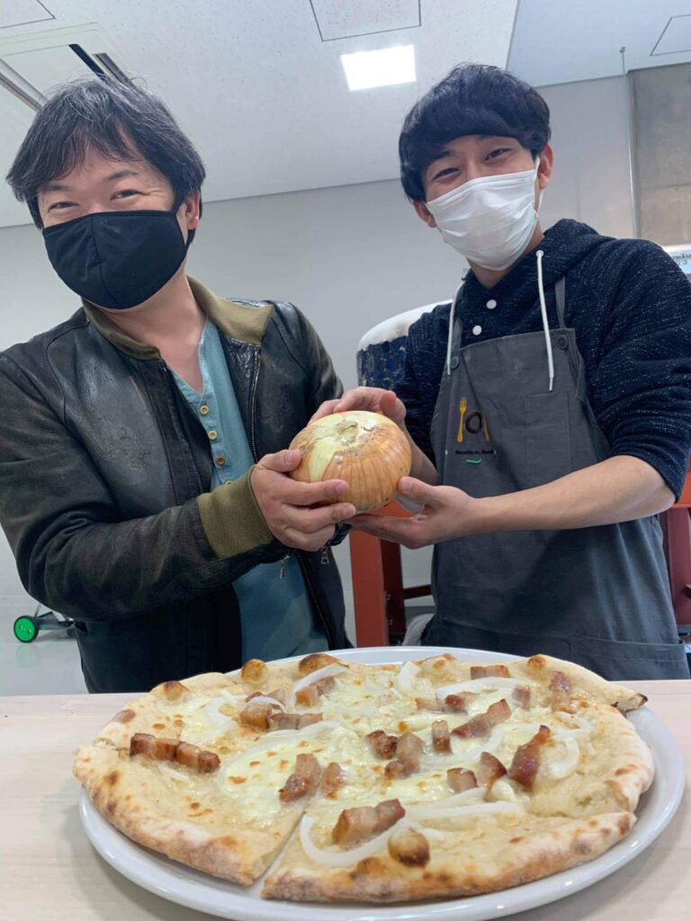 子どもさんの頭くらいある射手矢さんの大きなたまねぎを 立命館大学食マネジメント学部の和田教授にお送りしたら、さっそくナポリピッツァにトッピング!!
