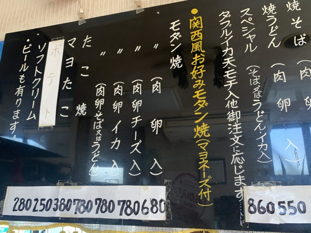 広島から西へ、在来線でのリサーチスタートです。 一軒目のちこさん。残念ながら営業されてなくて、次回は必ず! こちらは、関西風モダン焼が。マヨたこ、ソフトクリームも食べたかったです。
