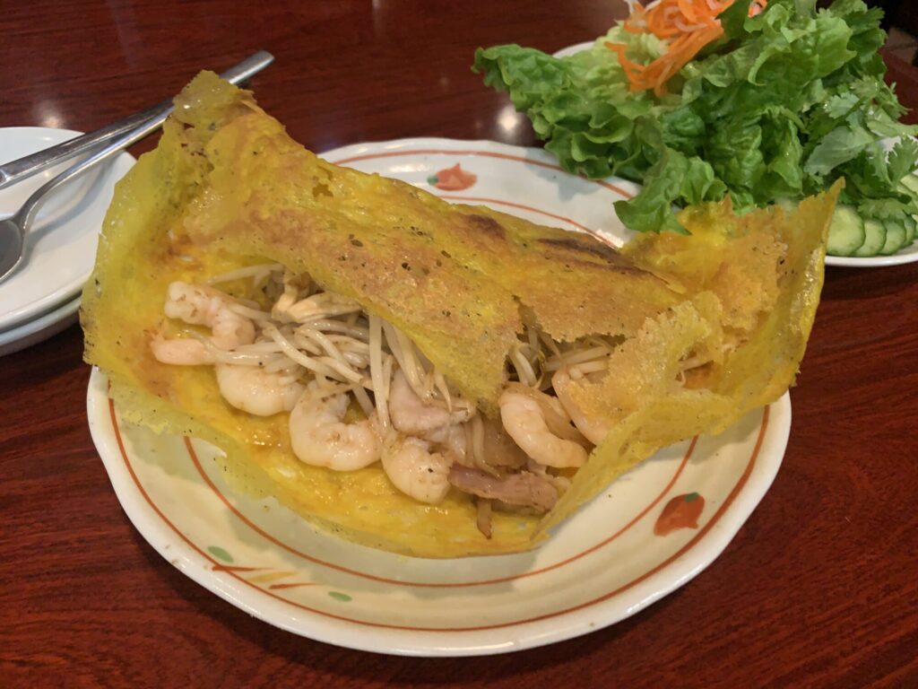 最近、バインセオの問い合わせが重なっています。 近所にもお店ができて、平日の昼間は行列ですし、野菜たっぷり、独特食感のコナモンが人気になるのはうなずけます。 こちらはたまたま入ったお店でしたが、歴史もあり、サービスもよく