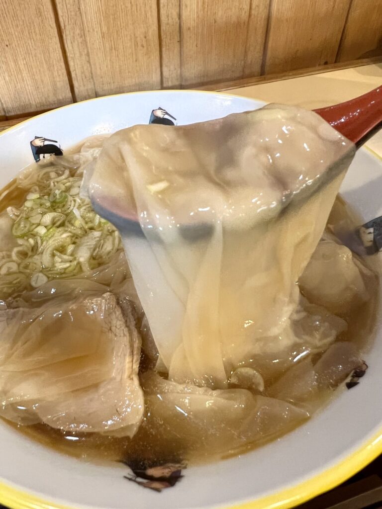 IMG_2936 大大大好きなワンタン麺、おそらく酒田は日本一ワンタン麺が濃いエリアではないでしょうか。まずは以前もおじゃまし、一辺20cm以上の巨大雲呑皮の三日月軒、中の口店へ。麺と時間差投入で、文字通り雲をお口に頬張