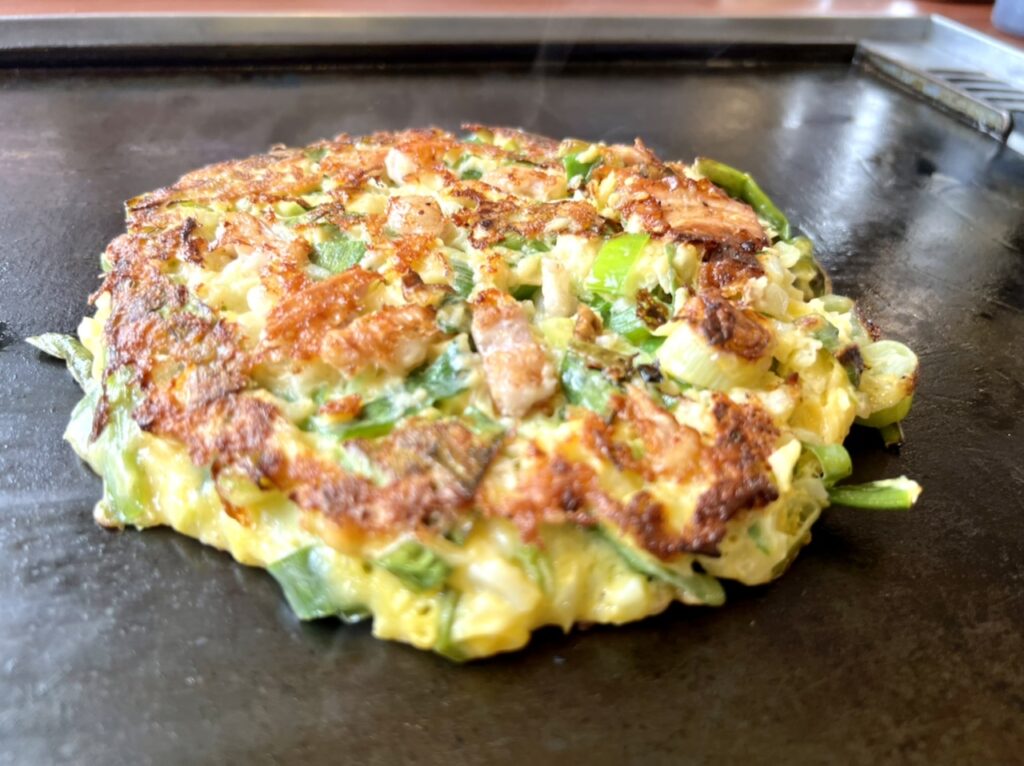 熊本にはユニークなお好み焼店が多いんですが、こちらのオリジナルはライス焼! お好み焼にご飯を入れるのは我が家も大昔からやっていましたが、こちらのライスはマヨネーズで和えたもので、焼くと軽くなって、ジューシィかつ、コクと旨