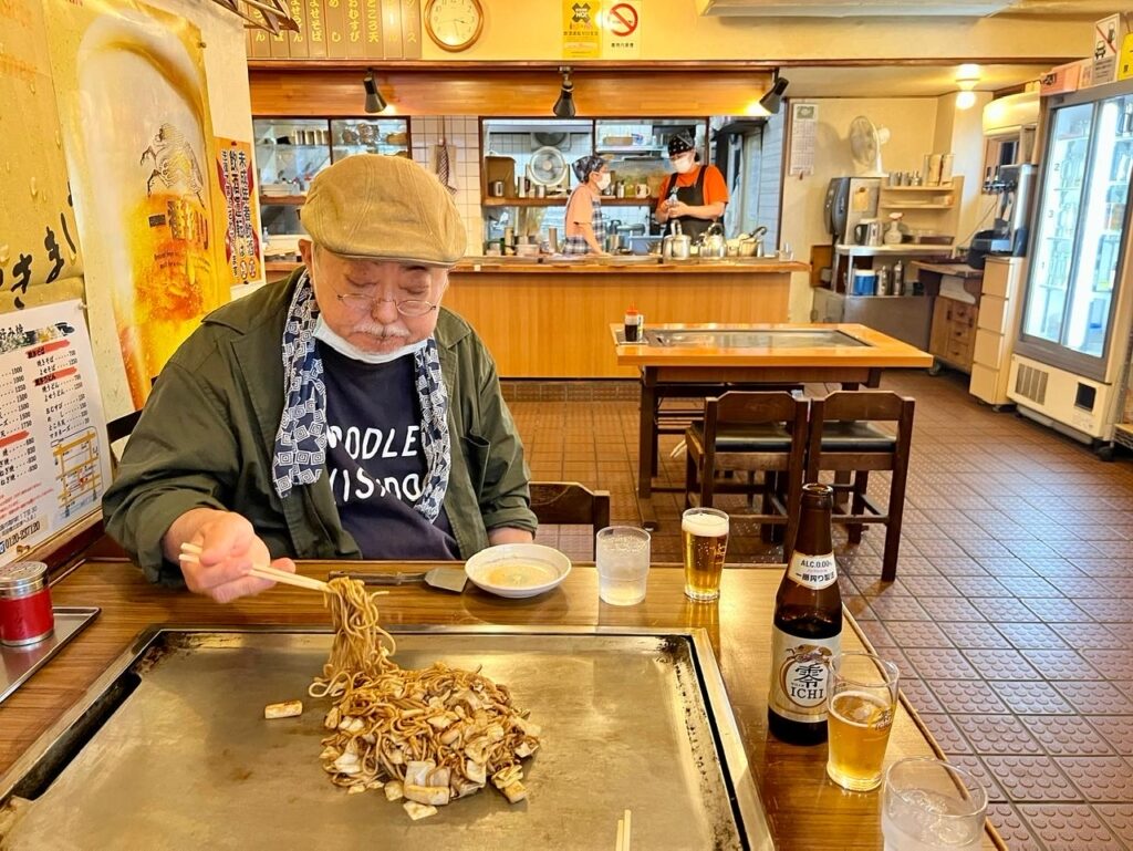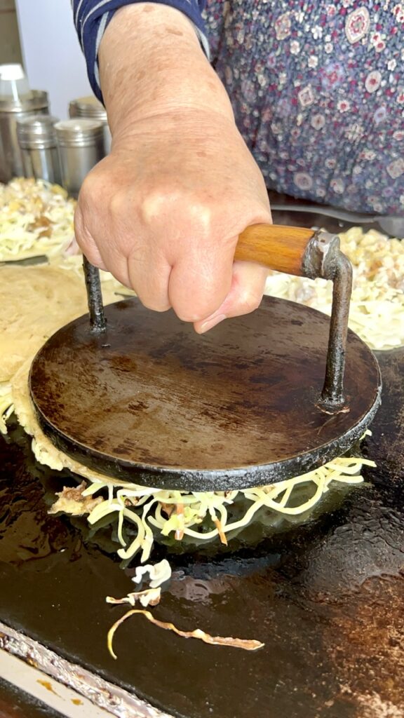 IMG_9658 名麺堂店主ガンボさんのご案内でお好み焼名店巡りはまだまだ続きます。こちらはお祖父様の代からガンボさん御用達だったそうで、当時は鉄板一枚。二つ折りやよせ焼き(=ミックス)というネーミングも変