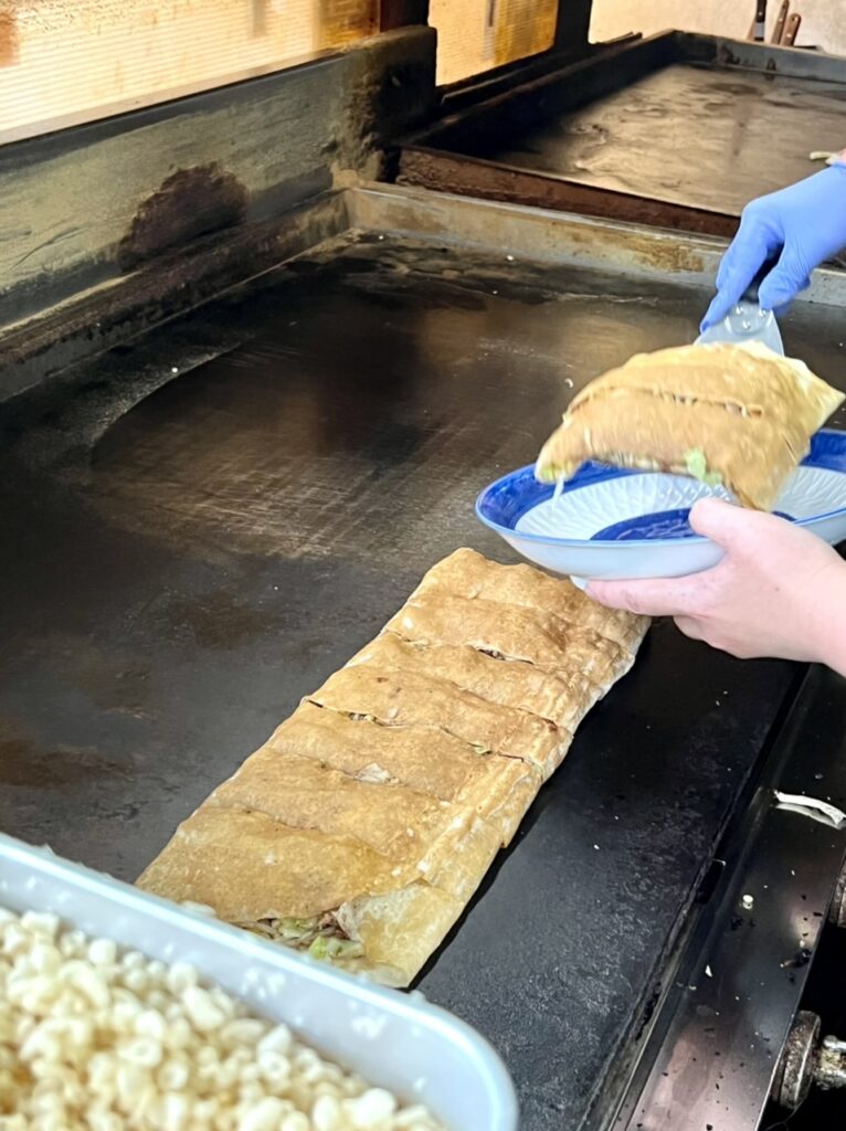 y 新水前寺駅前のお好み焼屋さんへ。こちらも生地をひいて焼きそばをのせるモダン焼です。何気なく焼いておられますが、お持ち帰りでも、ホンマにおいしい! #konamon #日本コナモン協会 #食文化 #熊本グルメ #vl