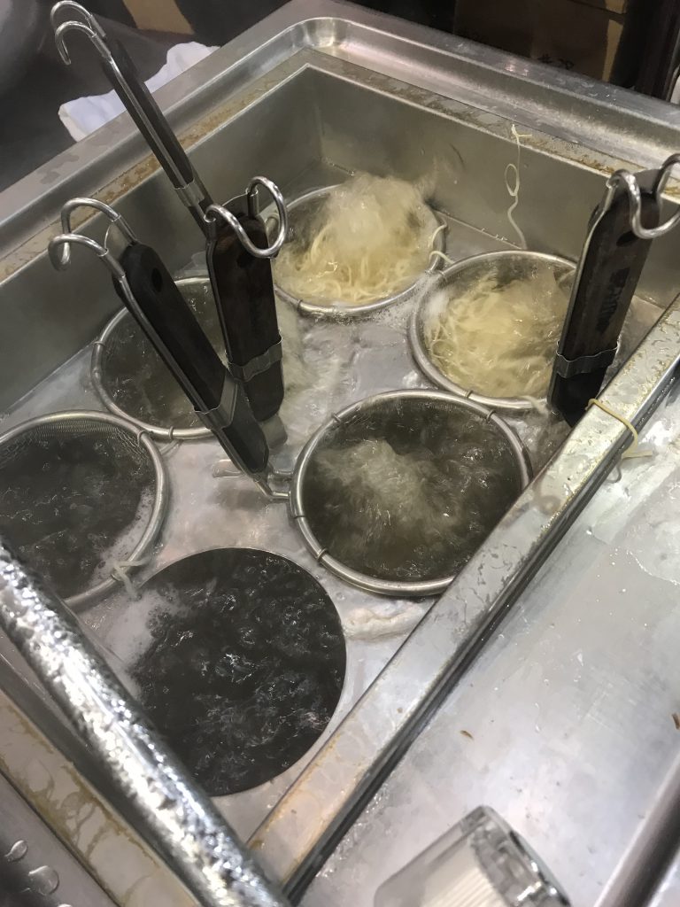 梅田の阪神百貨店リニューアル記念の最初のグルメ催事は、四国がテーマ。その主役は日の出製麺所だんです。三好社長からうかがっていたので、出かけてみると大人気! 売り切れ続出で、エビのすり身天ぶっかけにしました。 そのあとも試