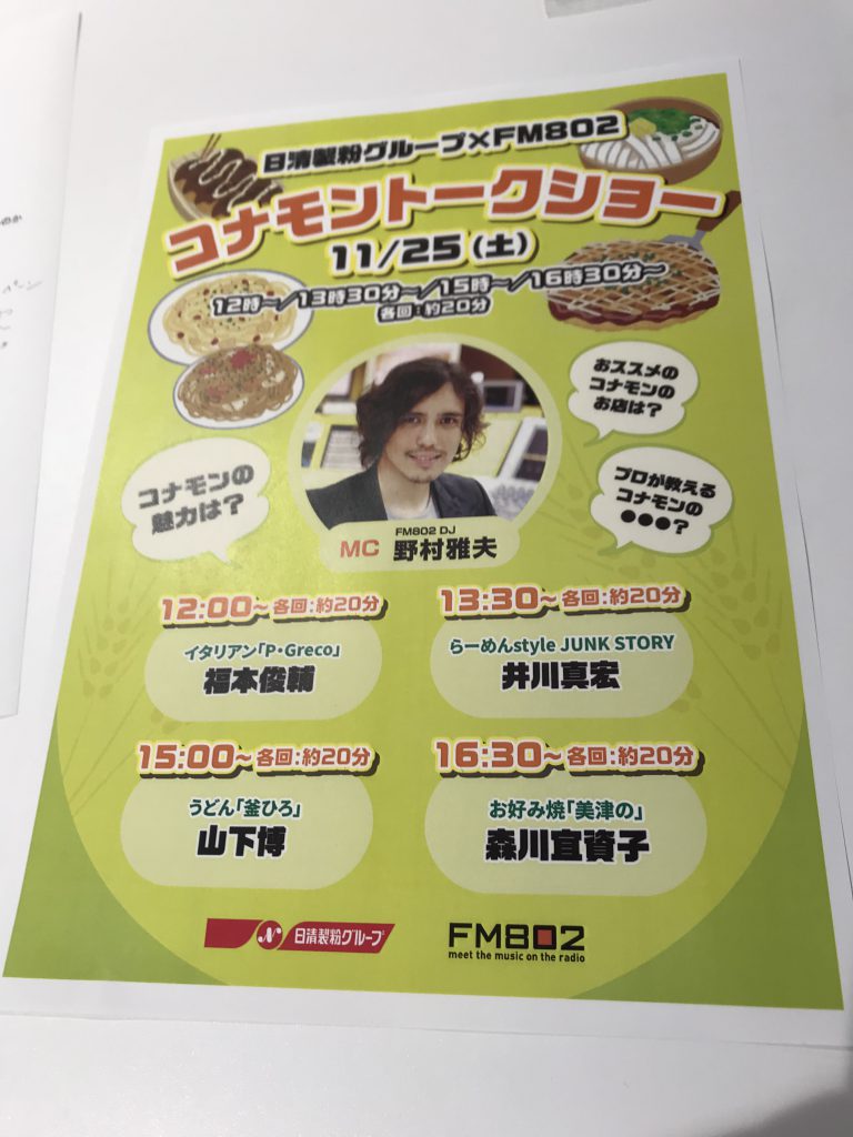11月25日(土)大阪マラソンEXPO 日清製粉グループ and FM802 コナモントークショー FM802「チャオ!ムジカ」の野村雅夫さん司会で名店の店主さんにご登場いただきました。 「P greco」福本俊輔さん、