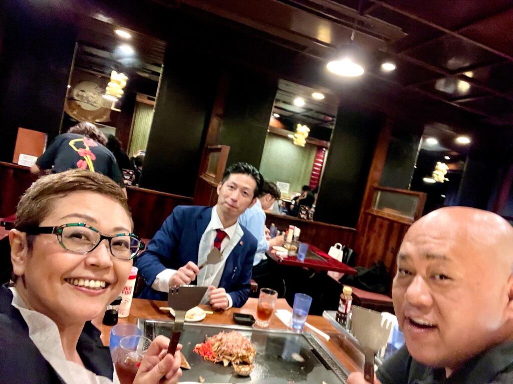 千日前での関西万博1000日前イベントの整理のために、甲賀流社長とゆかりさんで。ヤリイカのバター醤油、とんぺい焼、餃子、焼きそば、豚玉、いつもの安定感ある味わいを堪能しながら、ゆかりさんのフォーク付きテコに
