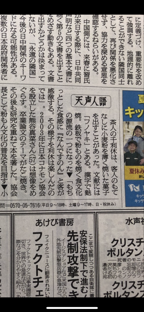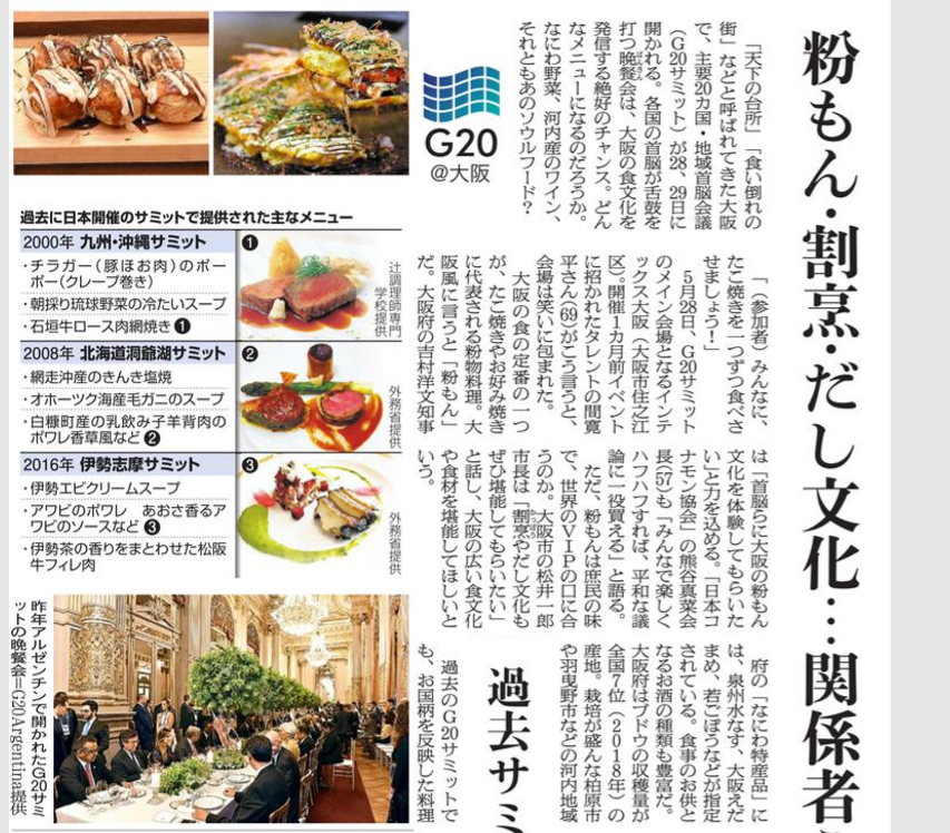 G20コナモン朝日新聞掲載記事(2019年6月15日) 会長熊谷がコメントさせていただきました。 今、この手のメディア対応に追われてたいへんです。 懐石料理などとちがい、コナモンは提供のしかたが難しいので、できればお店に