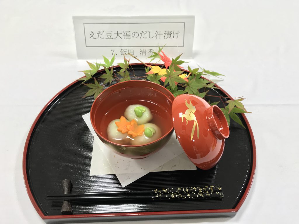 「和だし」を使った創作粉もんのグランプリに輝いた作品は、「枝豆大福のだし汁漬け」。 今回もハイレベルが勢ぞろい。 中日新聞の皆さん、岐阜調理専門学校の皆さん、今年もありがとうございました!