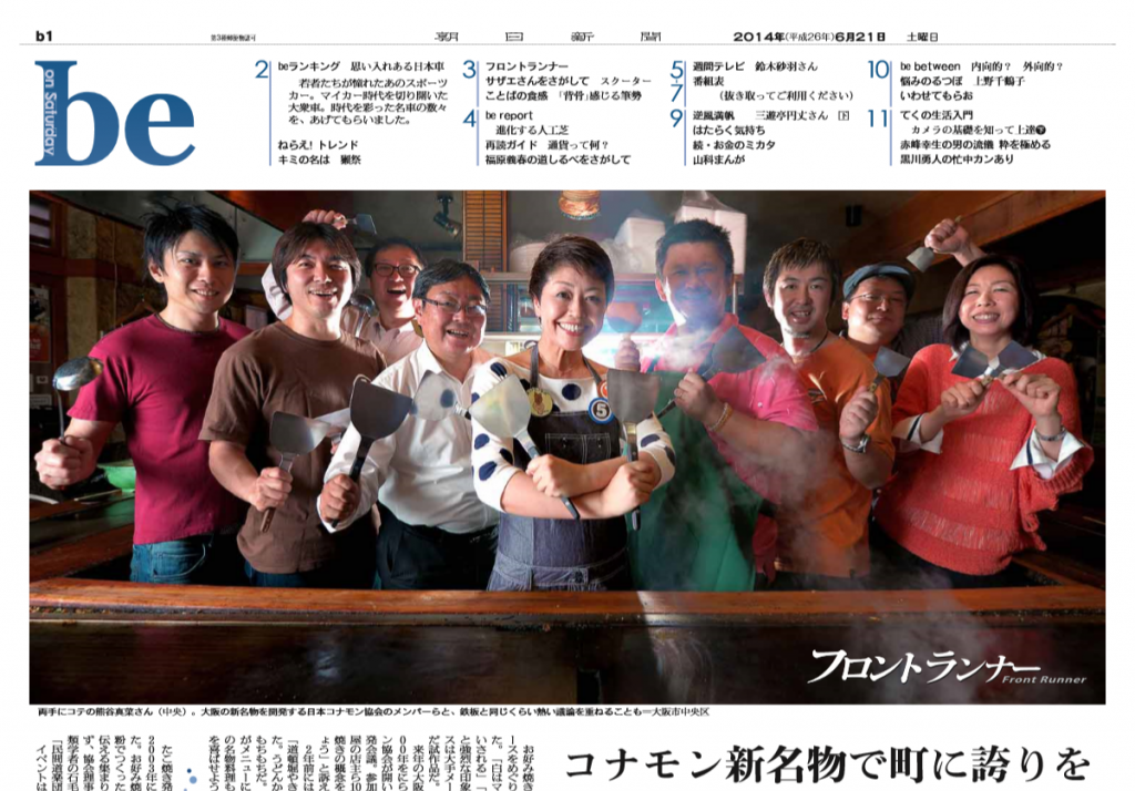 朝日新聞日曜版be フロントランナーの2014年に掲載された記事です。 福太郎さんの鉄板前で撮影されましたが、鉄板が熱くて腕がやけど状態になり、平出記者が軟膏を買ってきてくださったのを思い出します。 この記事のために、少