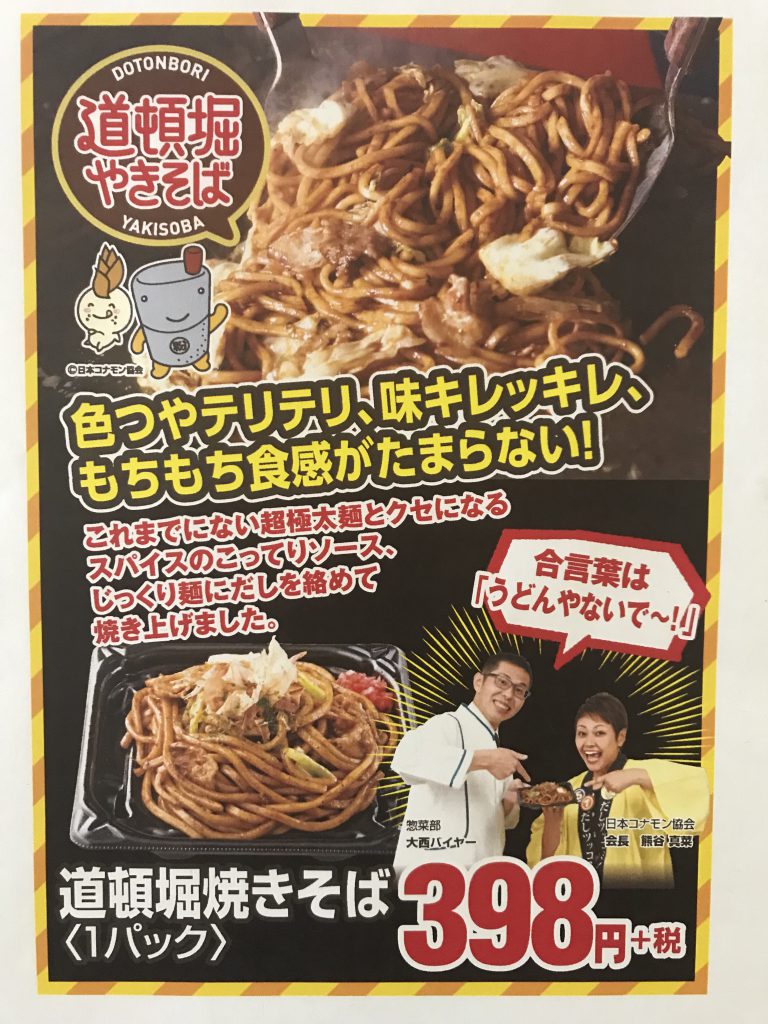 大阪の人気店店主さんらと開発した道頓堀やきそばが、6年目にはいりました。 おかげさまで、多くのお店に取り入れてもらってます。 また、量販店のイズミヤさんでは、特別に惣菜コーナーで期間限定発売中。 ぜひお味見してくだ