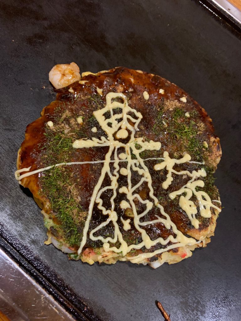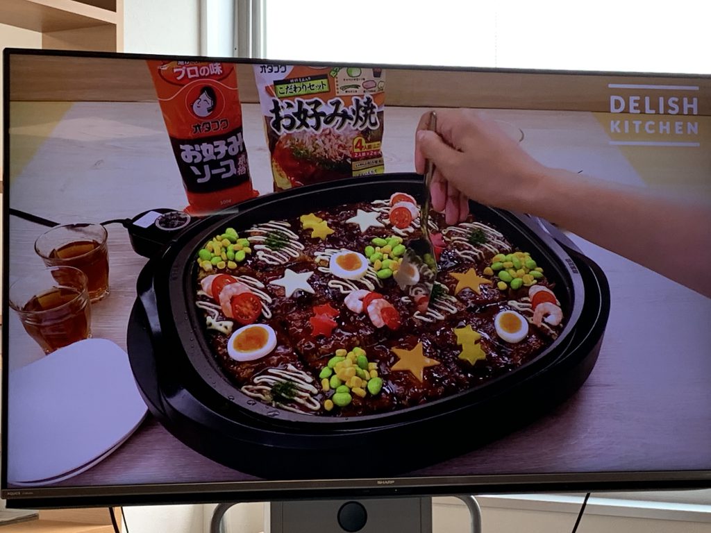 鹿児島といえば黒豚、ということで、黒豚のお好み焼きを。 自分焼きですが、動画が用意されていて、店員さんが生地と具材をのせてくれたあとは、 動画の通りにやけばいいそうです。 豚ののせ方が豪快で、これはいいヒントです! ソー