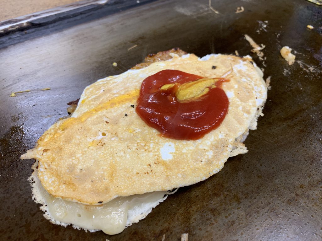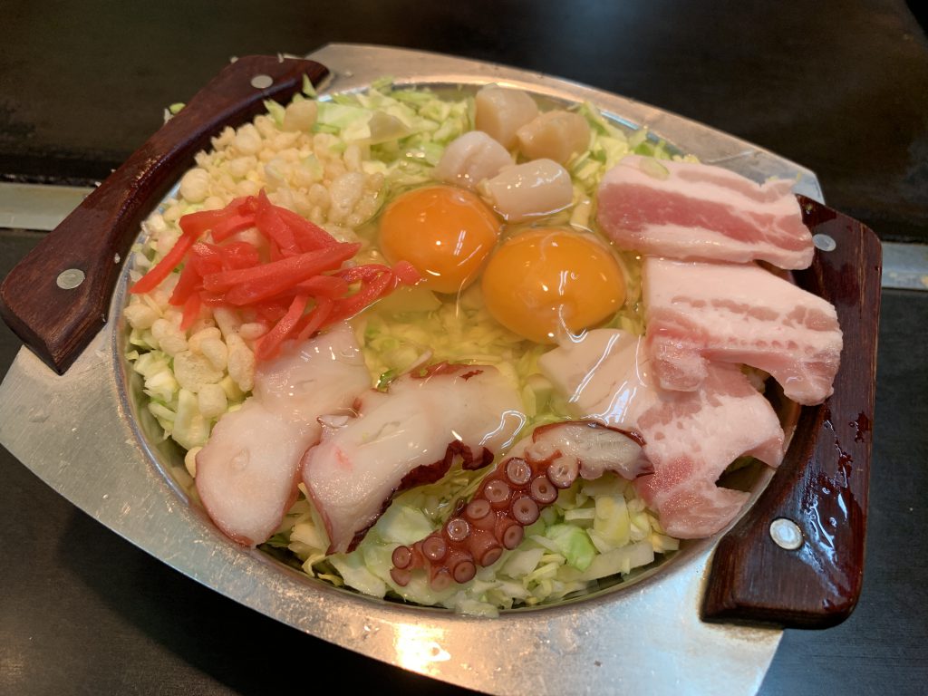 60年前、ロシアの抑留からもどったお父さんが考案し、味付けはお母さんが考えたと語る2代目女将の焼く、元祖とん平焼き。 生地の使い方が最高です! ソース、ケチャップ、からし、マヨ、 絶妙なバランス、豚をここまで高めた鉄板コ