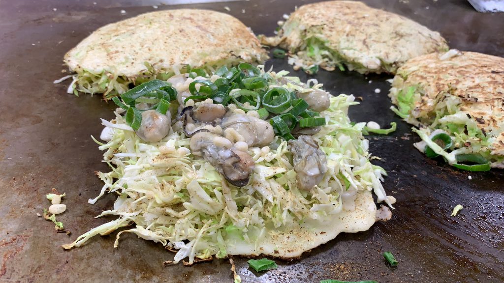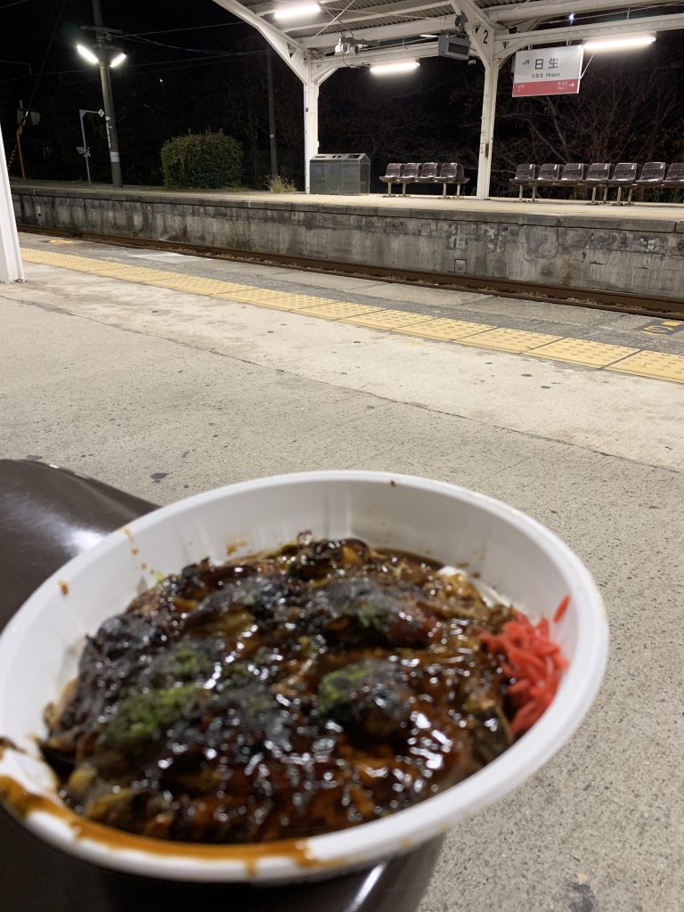 1枚食べたものの、やはりカキオコも、と思い、持ち帰りを頼みました。 少し時間があったので、ホームでカキオコ! これがまた最高に美味しかったです。 老舗の何店舗かは、午後早めの閉店なので、次は明るいうちにまいります。