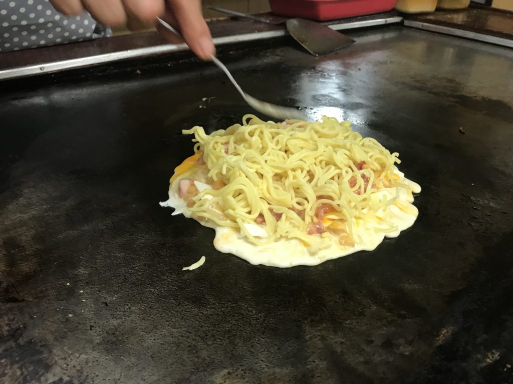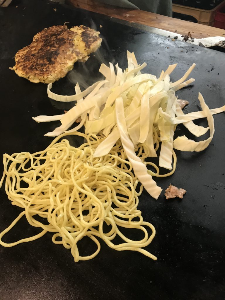 福山では、66年という老舗に出会いました。 やはり店構えからして風格あり。 店内のレイアウトも最高の雰囲気です。 焼きそばを頼んでみると、かまぼこ、ちくわ、もやし、豚、粗みじんのキャベツがはいります。 お好み焼きをた