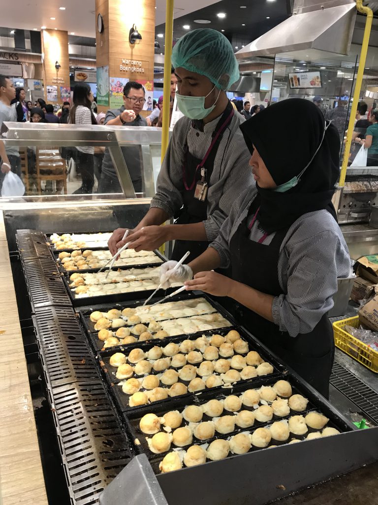 ジャカルタから西へ車で1時間くらいのエリア、タンゲランのイオンモールでも たこ焼き、お好み焼きが大人気でした。 焼いた端から売れていくので、焼き方も安心して見てられます。 人気はタコじゃなく、チーズかサーモン、味に