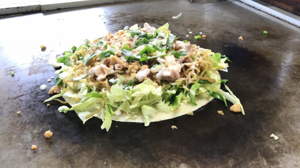 アメリカ村から、道頓堀川までのエリアも、たこ焼き、イカ焼き、お好み焼きのお店が増えています。 こちらは、昔からあるお店ですが、海外や日本の観光客が入れ替わり立ち代わりで、びっくりしました。 とん平焼きは生地をつかったもの