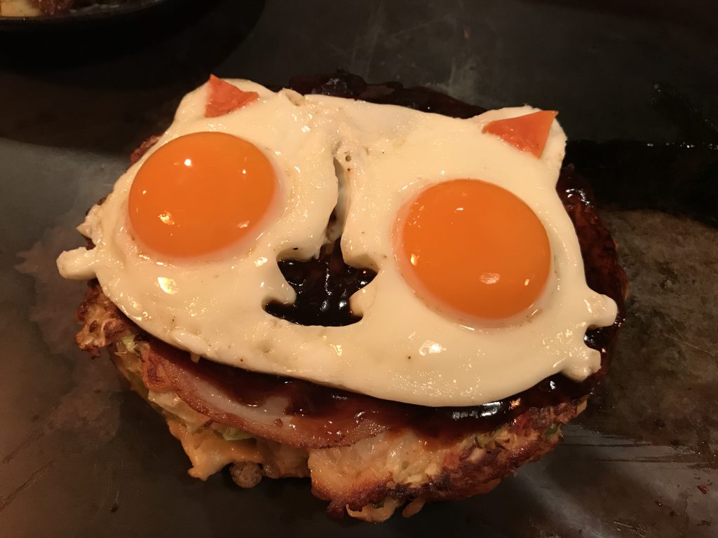 2015年に開催したマヨ画コンクール以来、久しぶりにはりきりました。 美味しい豚玉に楽しさon の素晴らしいメニュー。 オーナーの奥さんがパンクロックのベーシストなので、猫もパンク風にしたつもりです(^^;;