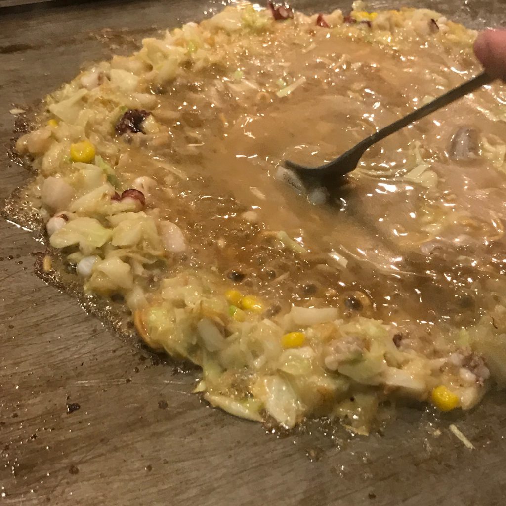 キャベツの大きさといい、混ぜ方、置き方といい、大阪らしい焼き方。 たいそうなこだわりは別段感じさせないんですが、食べてみるとめちゃくちゃバランスがいい。これが大阪お好み焼きの底力なのかもしれません。