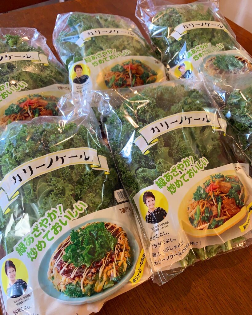 会長熊谷入りケールパッケージが登場です。 カリーノケールは加熱すると、緑がとっても美しく、おいしさもアップします。 トーストでも、パスタ、焼きそば、どんなメニューにも彩りに最適、しかも栄養価は高く 農家さんのお仕事を