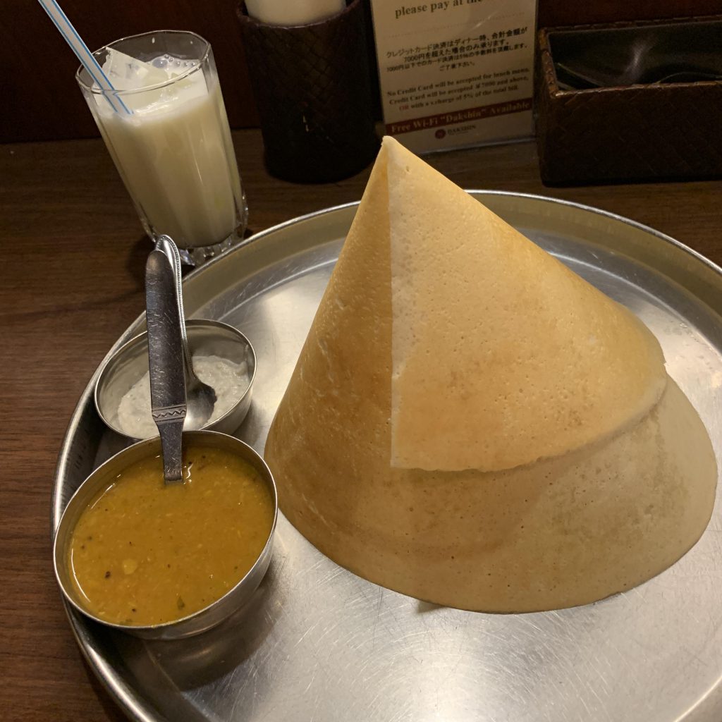 こなこな日和の取材以来、おじゃまさせてもらうインドのコナモンワールドです。 1人だったので、ドーサのハーフにしましたが、見た目のインパクトは・・ 豆粉と米粉のハーモニー、香ばしさがたまりません。 ラッサムとラッシーで、胃