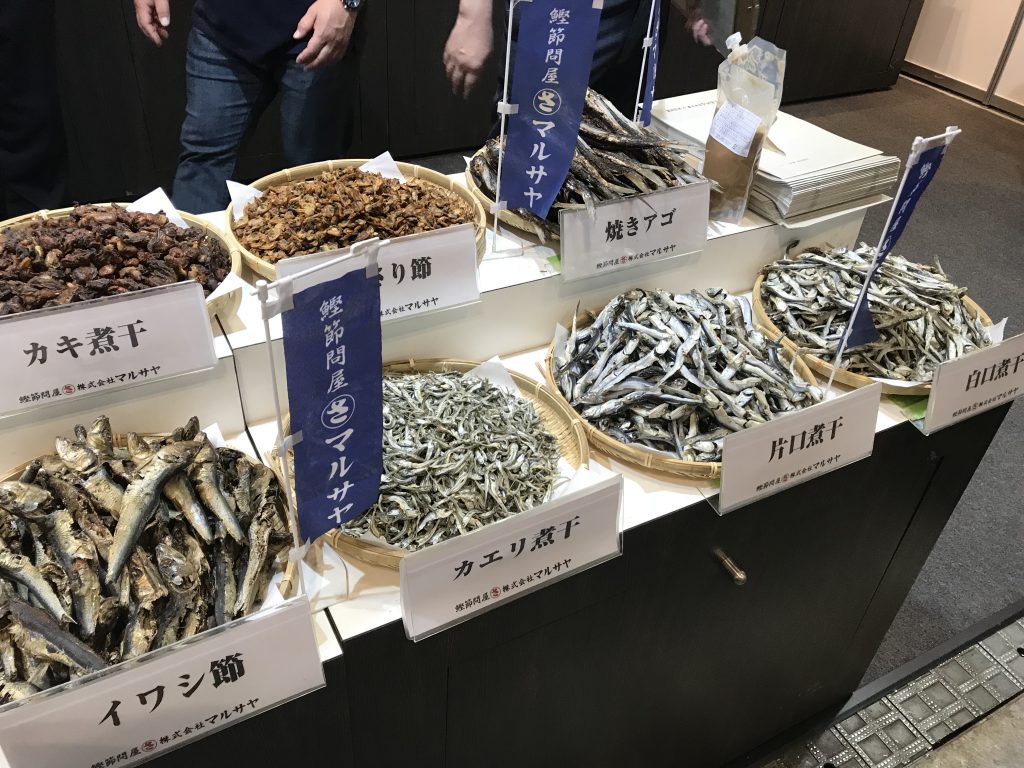 外食セミナーの展示会では、だし系のブースもたくさん出ていましたが、だし素材の展示が見事なマルサヤさんに立ち寄って、だし素材のことを丁寧に教えていただきました。 うちの親は、かえり煮干しが好きだったんですが、煮干しのなかで