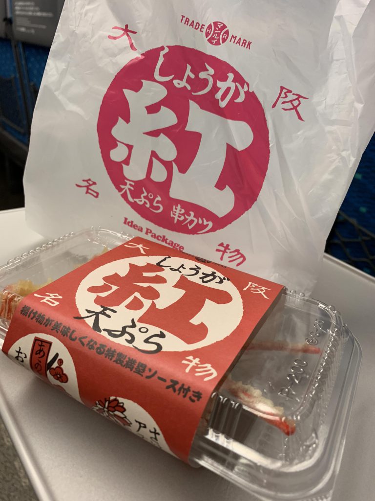新大阪のおみやげで、一番気になった紅しょうが天を買って、新幹線に乗りました。 まさかこんなおみやげになるとは、ショウガも真っ青、真っ赤でした。