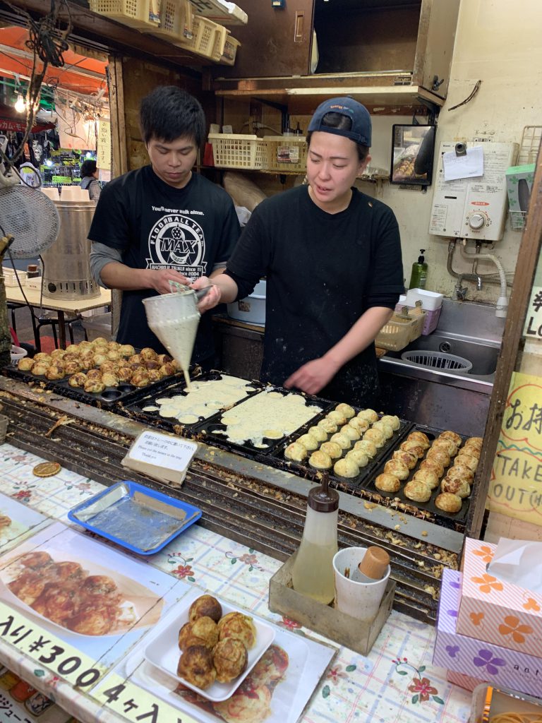 海外のお客さんでにぎわうアメ横で、人だかりができてるのでのぞいてみると なんとたこ焼き屋さんでした。 元気な焼き手さんは、4個200円をたのんだ私に、1個おまけを。 いまどき、このお値段で、この接客、鋳物鍋の焼き方まで、