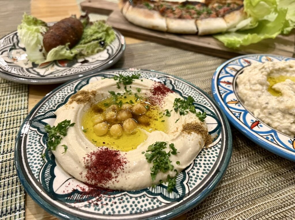 アラブ料理の下調べで、七つの丘さんへ。屋号の通り、ヨルダン出身の店主が本格的なアラブの味わいを提供。レンズ豆のスープ、ヒヨコ豆のホンモス(フムス)、焼きナスと胡麻のムタッバルをホブズ(パン)につけて頂きます。スフィーハは