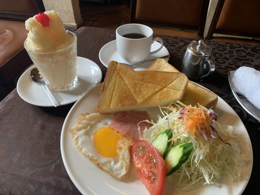大正14年創業、九州最古の長崎の喫茶店へ。 前回は、トルコライスを食べましたが、今回はシンプルにモーニングと、長崎ミルクセーキを。 パンの厚みは3㎝、切り目にバターがしみて最高です。 卵もサラダも王道のバランス。 このミ