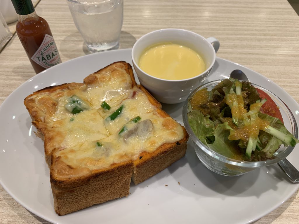 コーヒーマイスターのお店で、ピザトーストセットを注文しました。 コーンスープの美味しさとサラダ、を食べて、3㎝厚のピザトーストへ。 チーズのとろけ具合もちょうどよく、カルモブレンドのコーヒーに至るまで、幸せのひと時でした