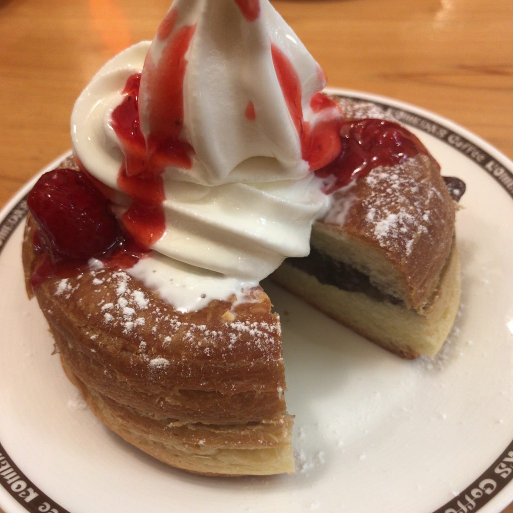季節限定 ミニ小倉ノワール@コメダ珈琲店 あったか〜いほっかほかの自家製デニッシュパンに、北海道産の小豆を炊いたコメダ特製小倉あんをサンドしています! トッピングはソフトクリームと甘酸っぱいイチゴソース。ひやあつのスイー