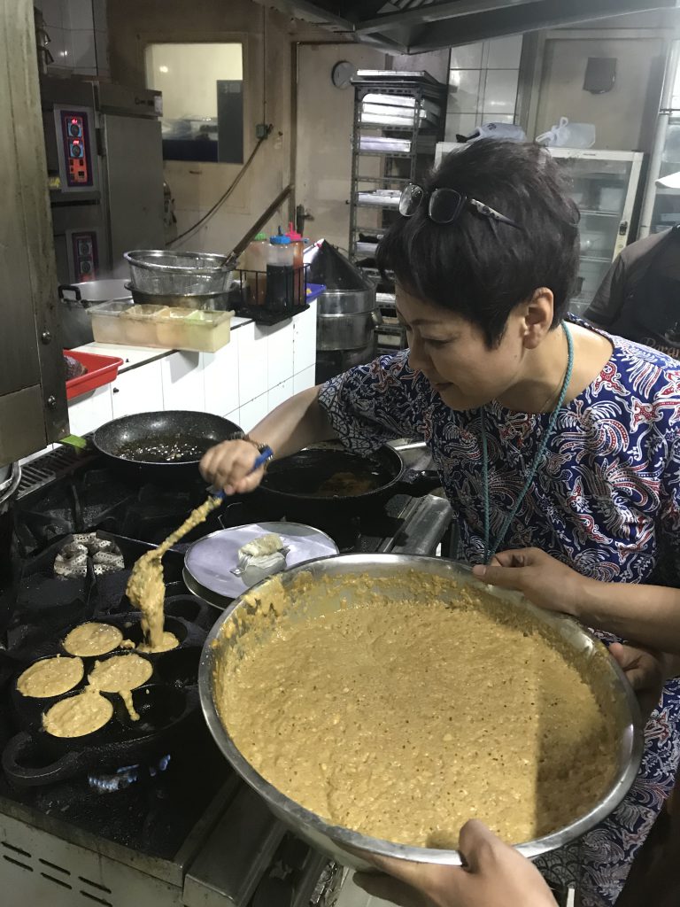 朝、通りを歩いていたら、ホッパーの屋台に出会いました。 米粉の生地に、パンダンリーフの香りと色付けで、一枚一枚丁寧に焼いています。 薄皮のところはパリパリのお煎餅で、真ん中はしっとりタイプ。一枚で食感のグラデーション