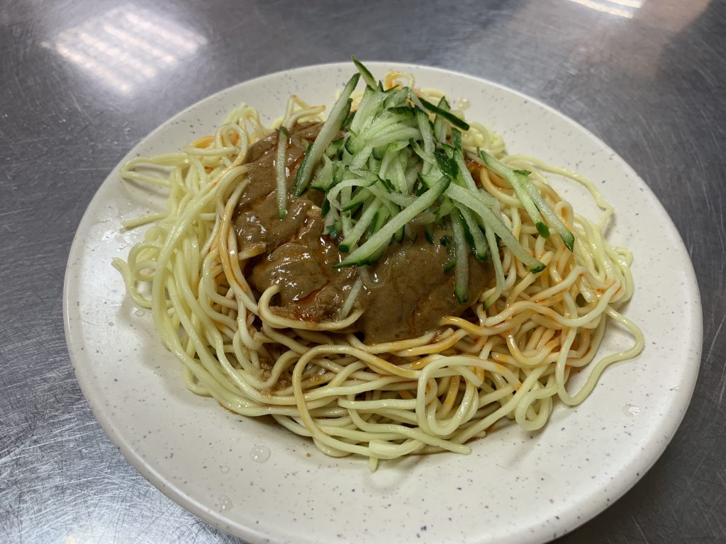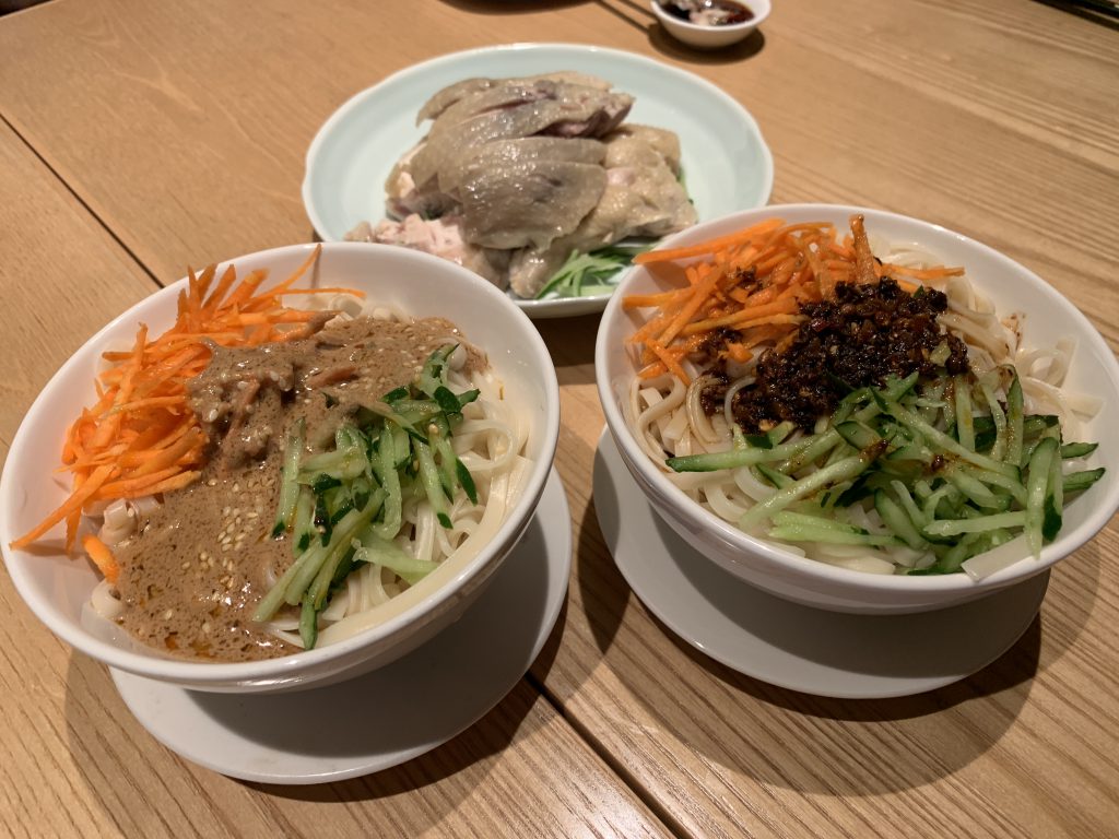 一同、トイレに行きたくなったので、こぎれいな中華料理店へ。 おススメのオムレツとゆで鶏、麺を2種頼みました。 麺は押し出し麺風で、弾力が弱く、胡麻だれ風の味噌も味がぼやけていました。 さすがに鶏肉はおいしかったですが、台