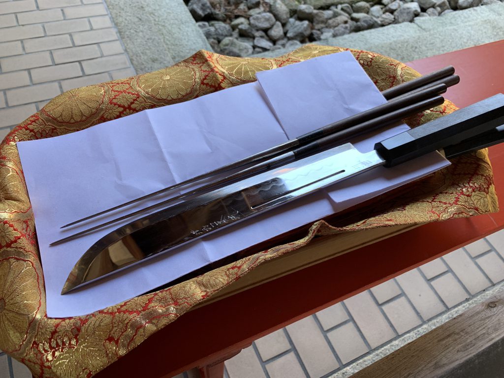 由緒ある大津の近江神社の記念祭で、お知り合いの料理長が包丁式を奉納されるので、出かけました。 神様への奉納なので、私たちからは後ろ姿しか見えません。 それでも、大きな身振りで刀のような包丁を激しく動かして、鯛がさばかれま