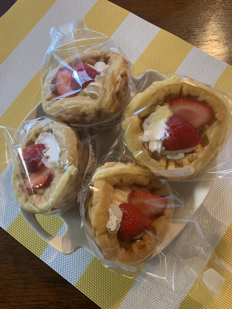 懐かしいおやつのひとつに、コロンバンのワッフルがあります。それに近いタイプが売っていたのでつい。クリームとイチゴ、ワッフル生地は 王道ですね。 わっふわっふる