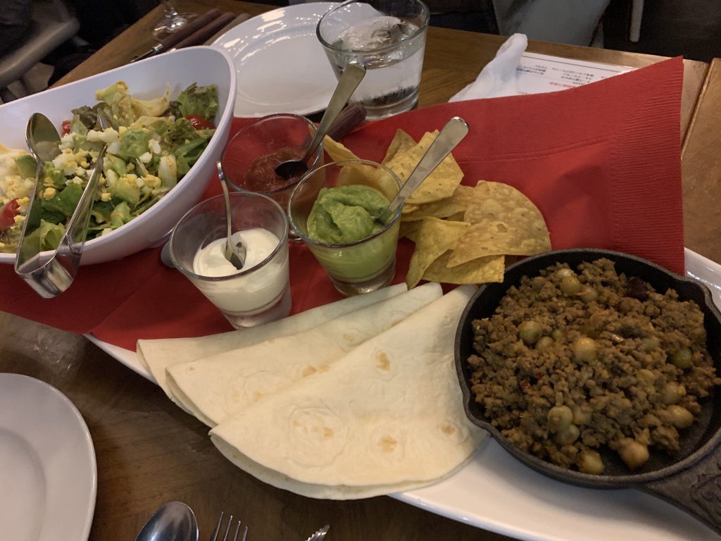 京橋の南米風レストランの最初にでてきたのは、タコス。 これはTEXMEXで、小麦粉タイプですが、このまま食べてもぜんぜんおいしくないのに、サラダやチリコンカン、ワカモレを巻くとおいしくなるのがびっくりです。