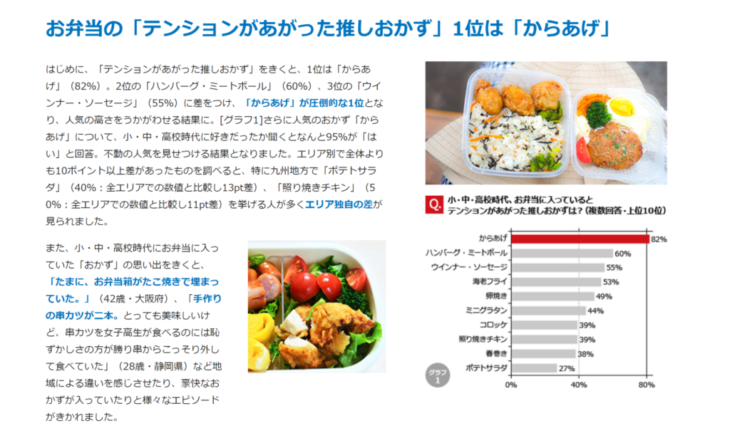 コロナ禍によるお弁当ニーズの高まりのなか Webサイト「コナモン探検隊」コナモン市場調査、お弁当の人気おかずデータが、最近テレビで活用されています。 東京MXの「日曜はカラフル!!!」 https://prtimes