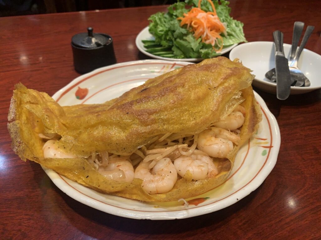 ベトナムのお好み焼きともいわれるバインセオ。日本の洋食焼きに近い感じがします。こちらのバインセオのパリパリの皮部分は秀逸ですが、ホッパーの焼き方に近い印象があります。ネムは揚げた生春巻ですが、具材が特徴的でチャイニーズの