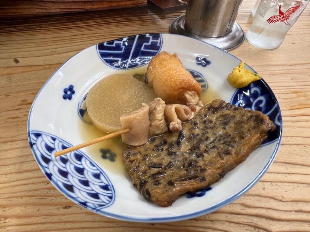弥太郎さん3日目、日田やきそばの前なんで、おでんにしました。熊谷定番の大根、牛すじ、きくらげ天に、ぎょうざ巻プラス。東京事務所長の肉玉子(他人)うどんも美味しそう! #うどん #おでん #天神南 #弥太郎うどん #だ
