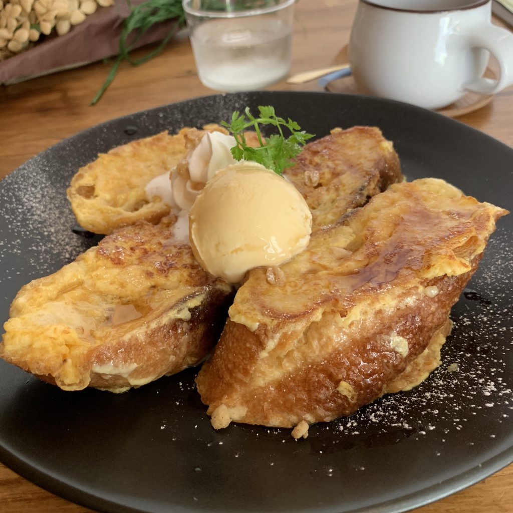 連日のカフェ巡りですが、お店ごとに特徴もあって、楽しい限りです。 千里丘駅前のこちらも居心地のいい空間で、夜は夜でメニューもあって、普段使いしたくなります。 バゲット使いのフレンチトーストは、バゲット生地が卵液にからんで