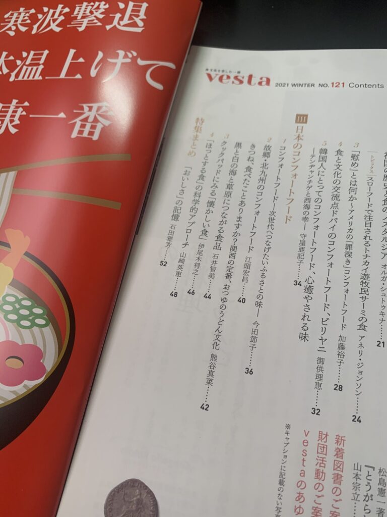 2021年1月発刊「vesta」121号、世界のコンフォートフードの特集で、会長熊谷がきつねうどんについて寄稿させていただきました。 冒頭にも大きくきつねの画像を採用していただき、私たちが愛してやまない、しかもいまでは