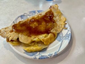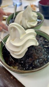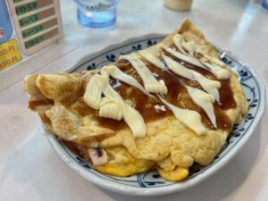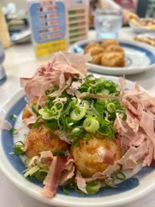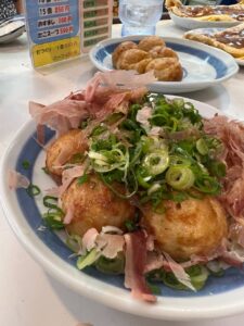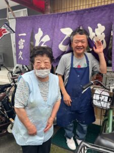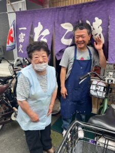 86歳になられる女将さんは、紅白なますやたこ焼を入れたお吸い物を作って、お客さんにサービス。たこ焼といか焼、女将さんのお気遣いも食べて、デザートは自家製ところてん黒蜜、ソフトクリームのせ!ビールセットもありますし完璧なたこ焼フルコースに満足できるお店の草分けなのです!